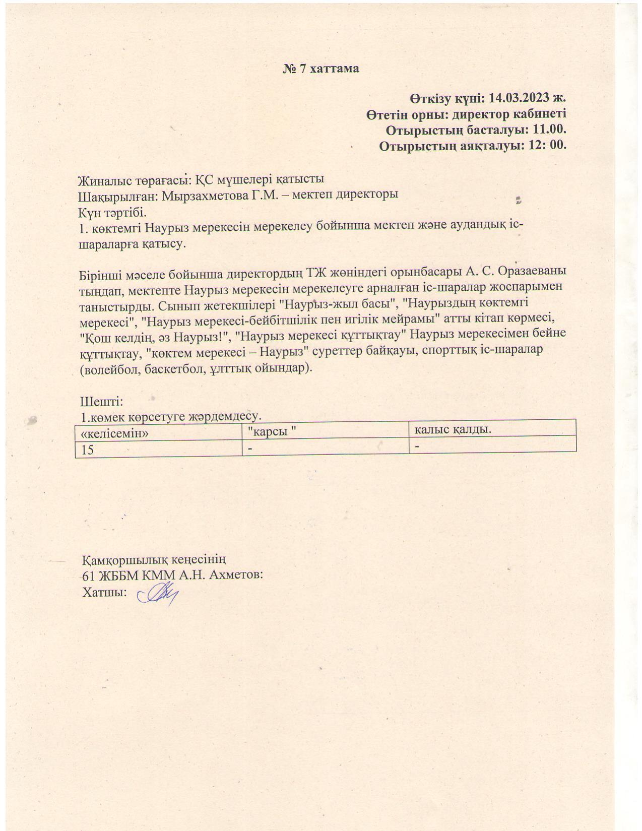 14 март 2023 0 1 2 3 4 5 Протокол ПС № 7, Хаттама № 7 Протокол № 7 от 14.03.2023г., Хаттама № 7 04.03.2023ж. Осы беттің QR-коды:QR-код этой страницы: