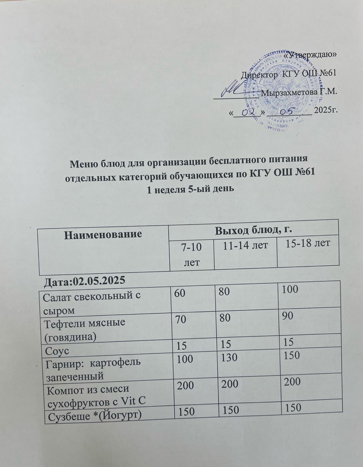 Меню 1-ой недели 5-ого дня