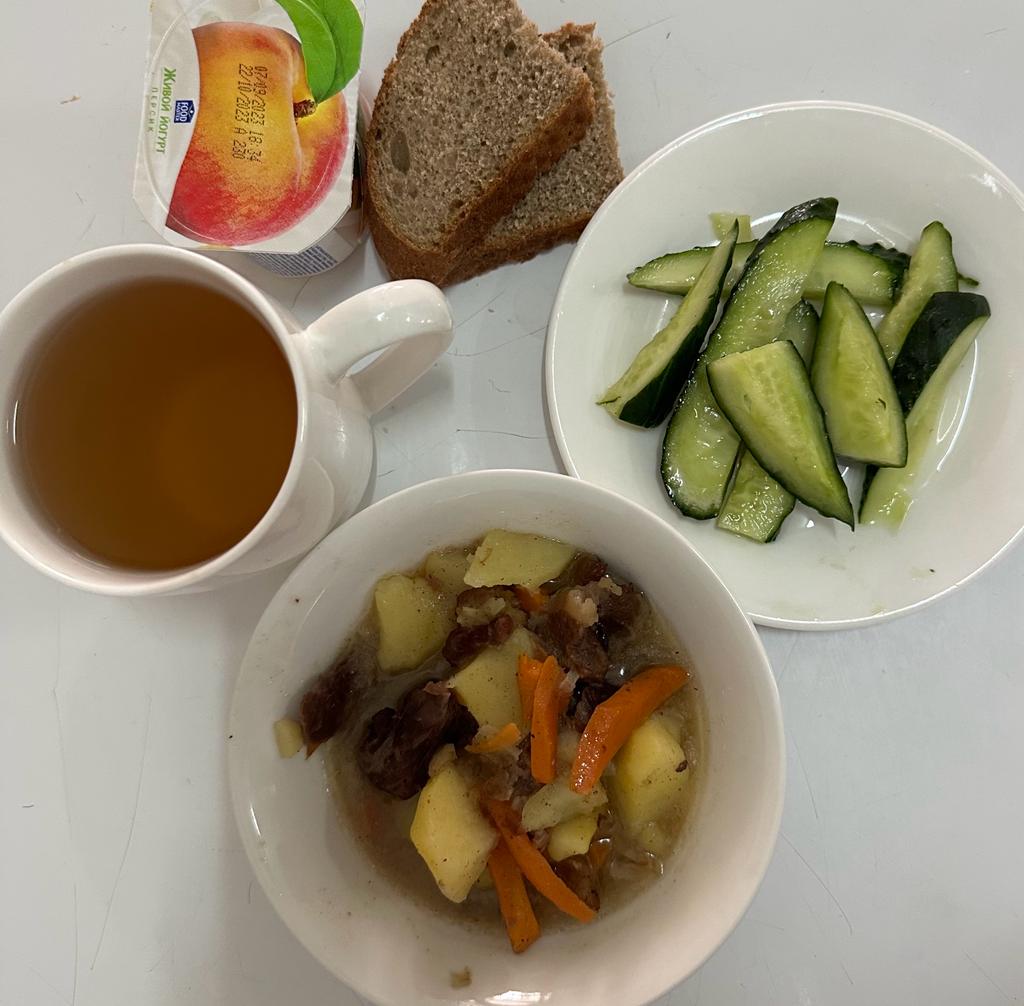 Мәзір: рагу (сиыр еті) және жаңа піскен қияр салаты, меню: рагу(говядина) и салат из свежих огурцов